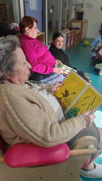 Après la sieste des enfants, les résidents ont pris plaisir à leur lire des histoires. Chacun a pu participer à son tour à cette activité pleine de douceur, sous le regard bienveillant des professionnels de la crèche. Les échanges entre les enfants, les auxiliaires et les résidents ont créé une atmosphère chaleureuse, faite de rires et de curiosité.