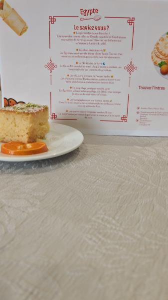 Pour ce « décollage » gourmand, un menu aux saveurs égyptiennes a été proposé. Les résidents ont pu découvrir ou redécouvrir les falafels, délicieuses boulettes croustillantes à base de légumineuses et d’herbes aromatiques, très appréciées dans la cuisine du Moyen-Orient. Le plat principal mettait à l’honneur le hawashi, un pain farci de viande épicée puis grillé, spécialité populaire et conviviale souvent dégustée dans les rues du Caire.